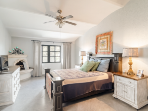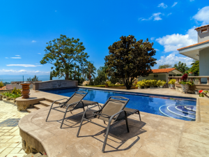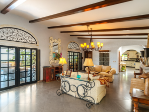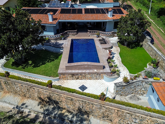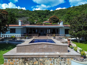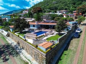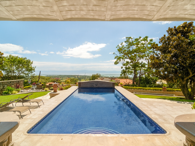 After 30 years of selling homes at lakeside it is with great pleasure, I bring you this spectacular lake and mountain view home that will make entertaining friends and family a joy. Enter via an arched foyer to this one level home and you are greeted by the vaulted ceilings in the great living room on to which two black wrought iron doors that lead you out to a massive, covered terrace. The two master bedroom suites each with their own distinctive bathrooms and closets flank the southern facing terrace with access direct to terrace from each bedroom. With only a few steps away the solar heated lap pool is bordered by two gorgeous mature Magnolia trees that frame the unstoppable view of Lake Chapala. On the west wing of the home, you’ll find a superb custom-built kitchen with a massive butcher block island, a custom-built wooden bar, lake view dining room with a charming fireplace, large office, half bathroom and a back door entry mud room, pantry and laundry room. Yet there is more, a separate building with a lake view that could be used as an art studio, hobby room or a separate sleeping quarters for the grand kids. Full solar electric system, one car covered parking with off street for 3 more cars and loads of storage. Located in the quiet and secure Vista del Lago, a superior gated community with 24-hour security and 365 days a year 24/7 supply of good clean water pumped right into to your home. And to top it all off a wonderful 18-hole golf club with restaurant and bar service’s.
